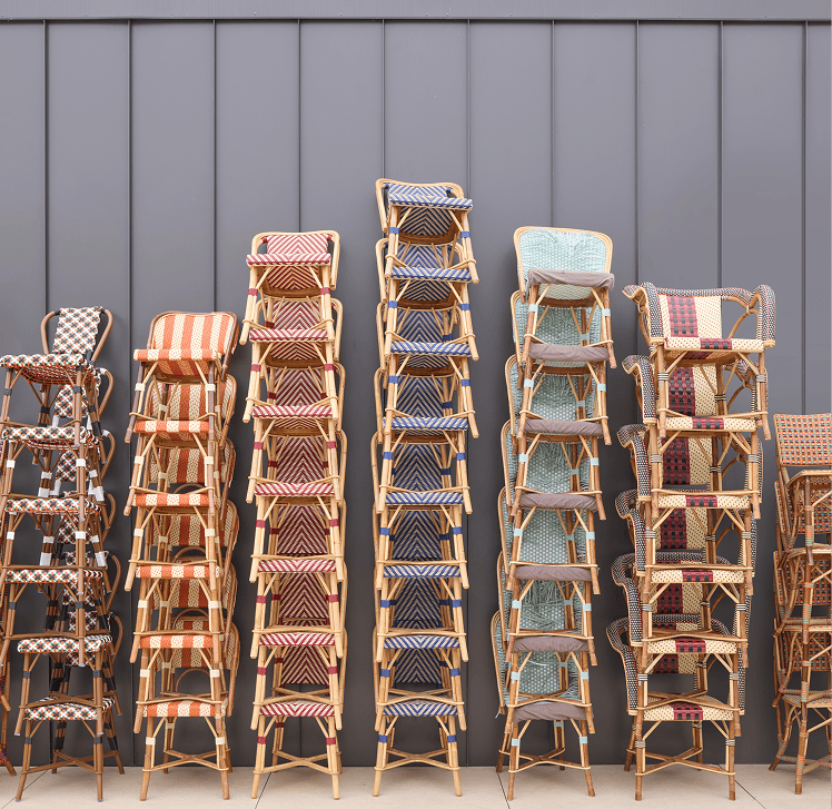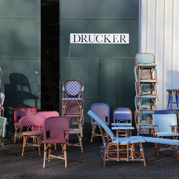 Sensitive to the announced shortage of rattan, and eager to maintain the more than centennial image of the Parisian Bistro Chair while offering its customers products combining aesthetics, comfort, and durability, Maison Louis Drucker chose aluminum as an alternative material. The choice of aluminum is a very considered one. Aluminum tubes are almost as light as rattan. Aluminum is worked in a similar way to rattan: it can be curved and bent. Maison Louis Drucker has developed an epoxy paint in colors identical to those of rattan. The weaving techniques are different but perfectly mastered by our wonderful weavers. Virtually all Maison Louis Drucker furniture can be made with either rattan or metal frames. Decoration professionals are often fooled.