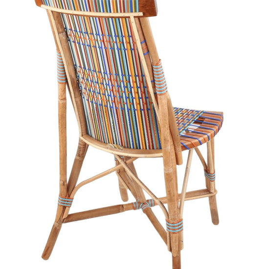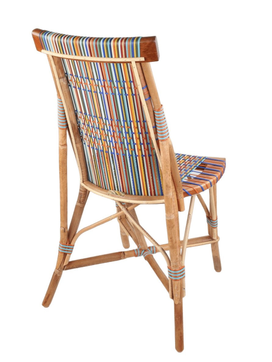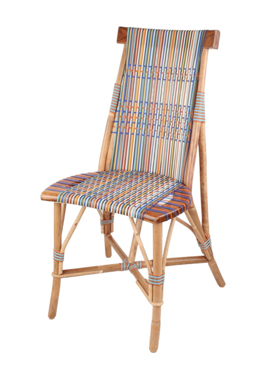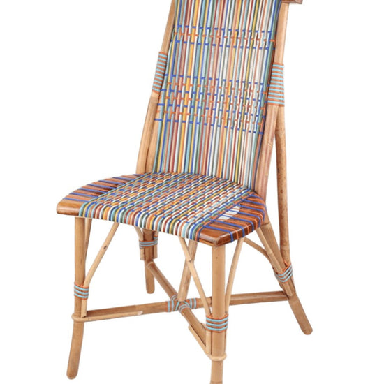 Light rattan and wood chair, Prestige weaving pattern in beige, white, lavender blue, royal blue, purple maroon, chocolate, blue grey, grey, ivory, turmeric yellow, bright yellow, black, weathered gold, light pink, pink, carmine red, terracotta, water green, olive green. Robust, light, durable, stackable furniture to bring in during the off-season. Designed by Philippe Model.
